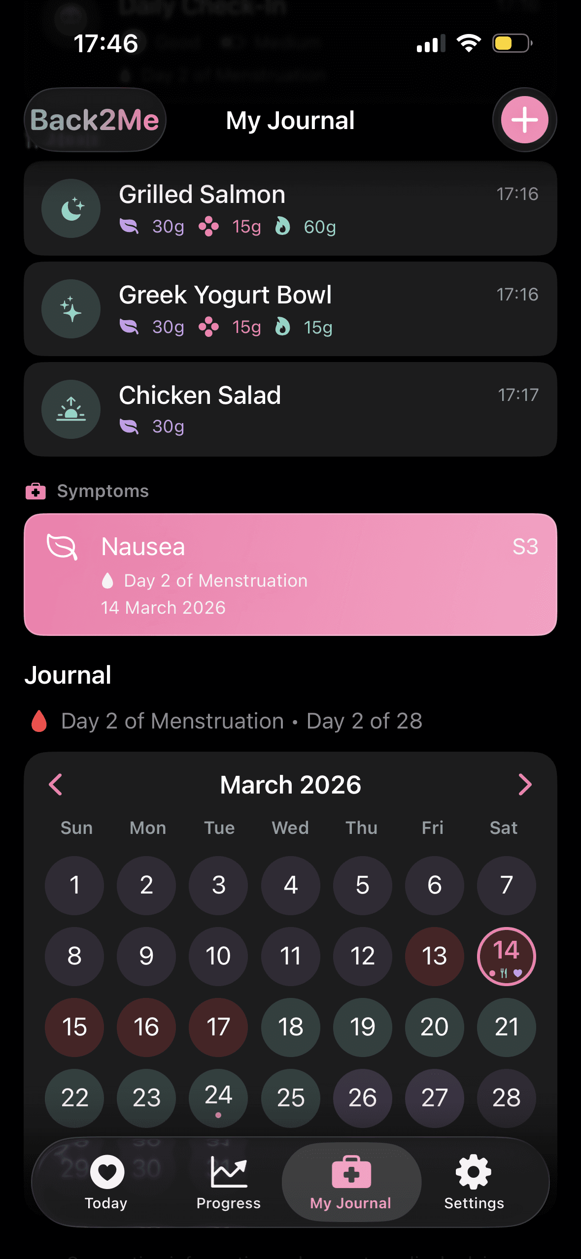 Back2Me helps you notice how your cycle, hydration, food and energy interact so you can adjust your habits and avoid unnecessary crashes.